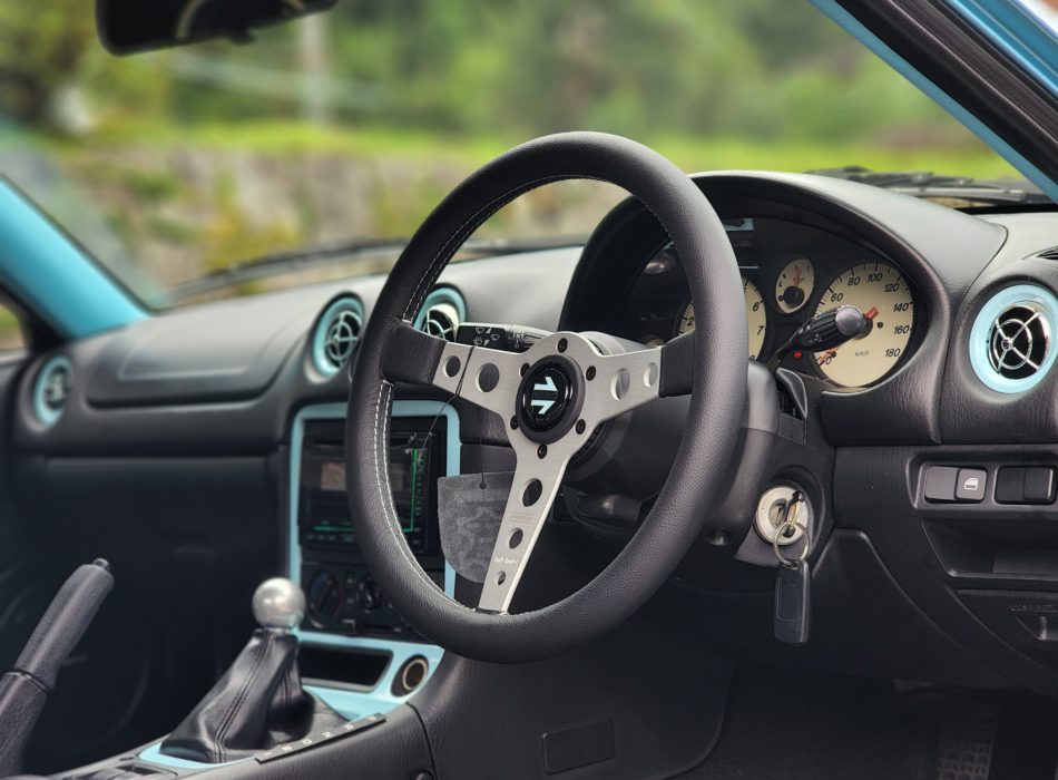 ボディーには大きな改良・塗装を施さず、傷や劣化パーツの修理する部分に手を加える事で1から仕上げたかのようなカスタムNBに変化させた1台。内外装共にポイントを押さえたカスタムにより素材の持ち味を最大限生かした仕上がりになっています。