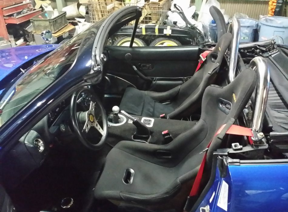 フロントバンパー、フロントスポイラー、リヤバンパー、リヤガーニッシュ、ダックテールスポイラー装着でシャープなボディーラインにしていきます。ボディーには若干の個体差が有る為取付には調整が必要となります。車高とホイールの選択幅を広げる為フェンダーの爪折り作業もします。幌、内装、エンジンなども取り外します。