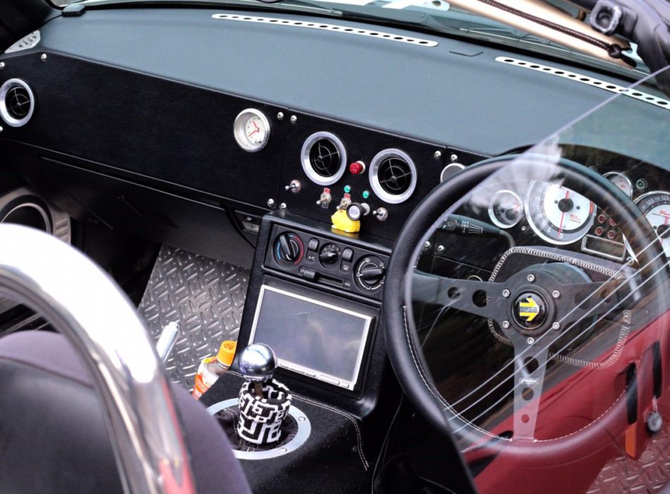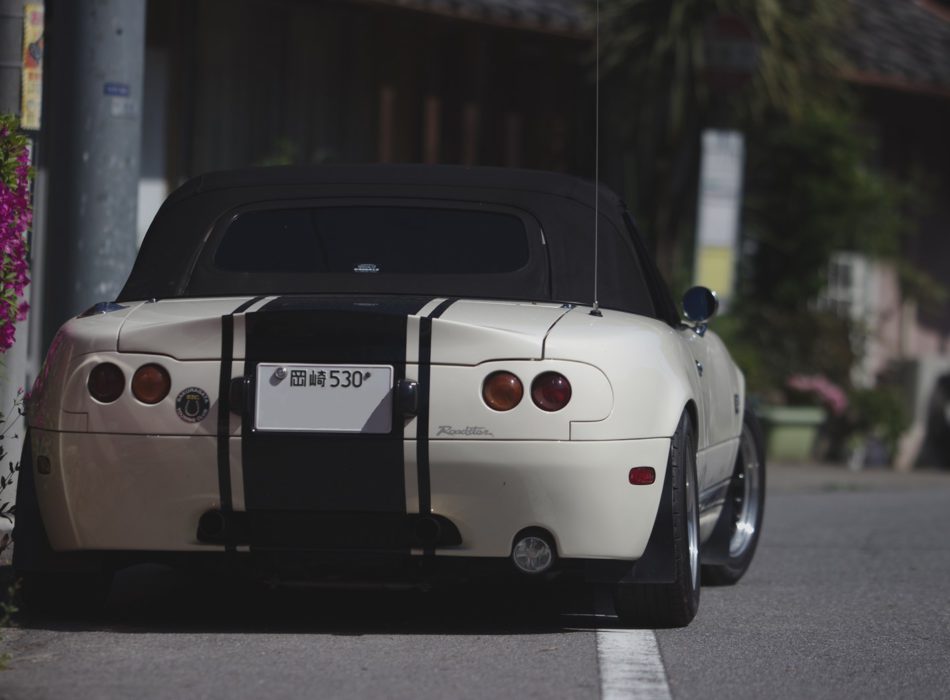 ニコイチといっても、2台のクルマを繋ぎ合わせたわけではなく、NAのフレームにNBの足回りや機関部を移植するといった贅沢な仕様になっており。“shin-kai R08 TypeⅡ”専用エアロパーツをクラシックホワイトにグリーンのセンターストライプに塗装し仕上げています。走りとデザインが融合したNAロードスター究極のカスタムカーです。