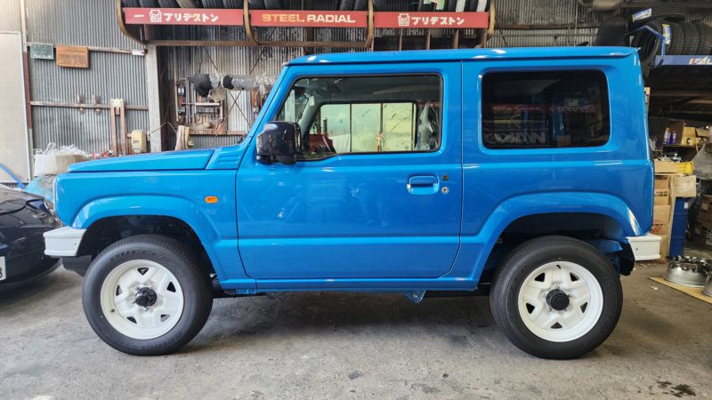 ブルーメタリックのノーマルジムニーは黒色の面積が多く