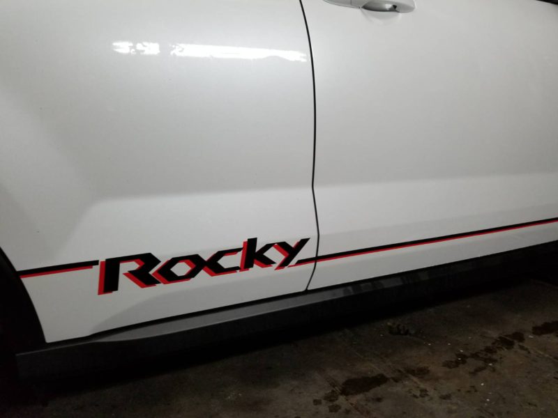 Rockyのロゴを入れたサイドストライプの製作に取り掛かります。