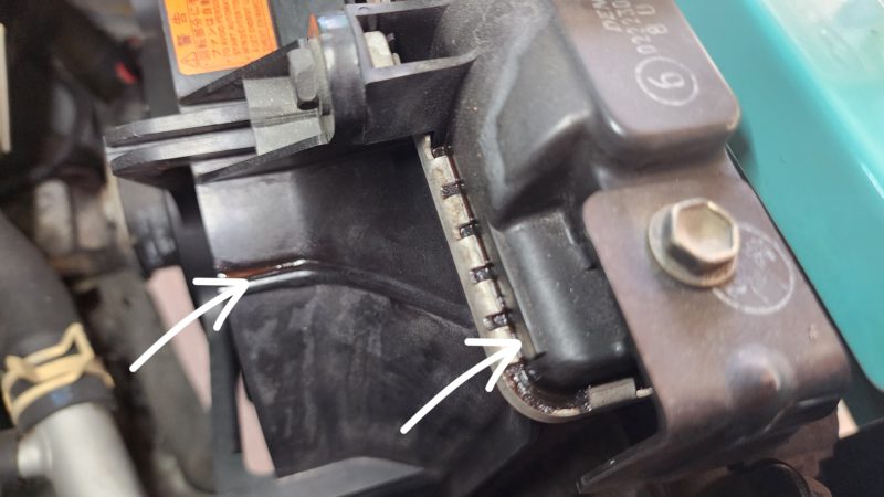 アッパータンクの継ぎ目から冷却水が滲み出てます。