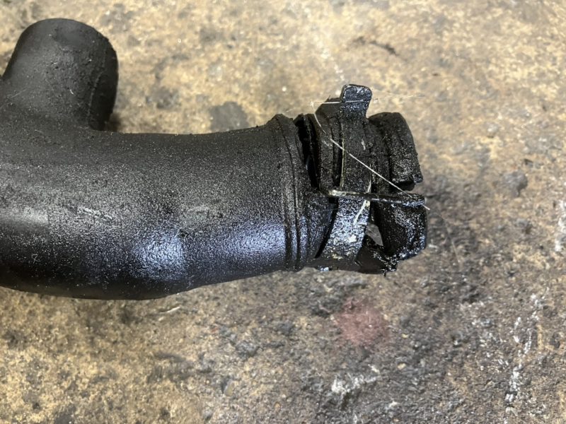 高速回転中に千切れたベルトの影響で破損したパイプ。