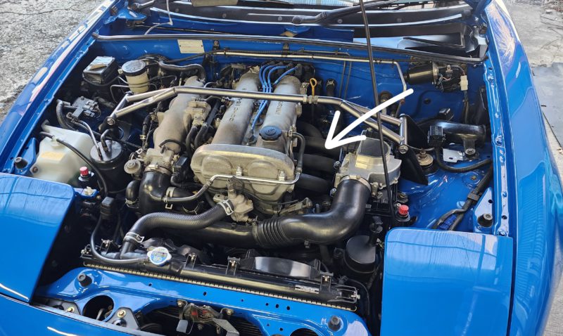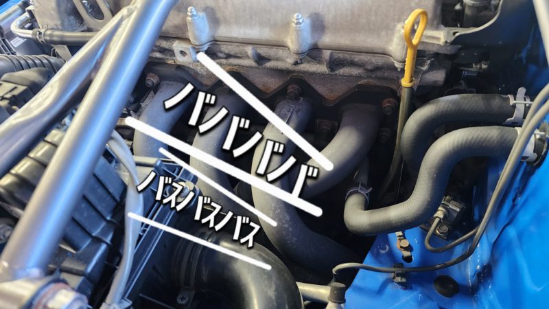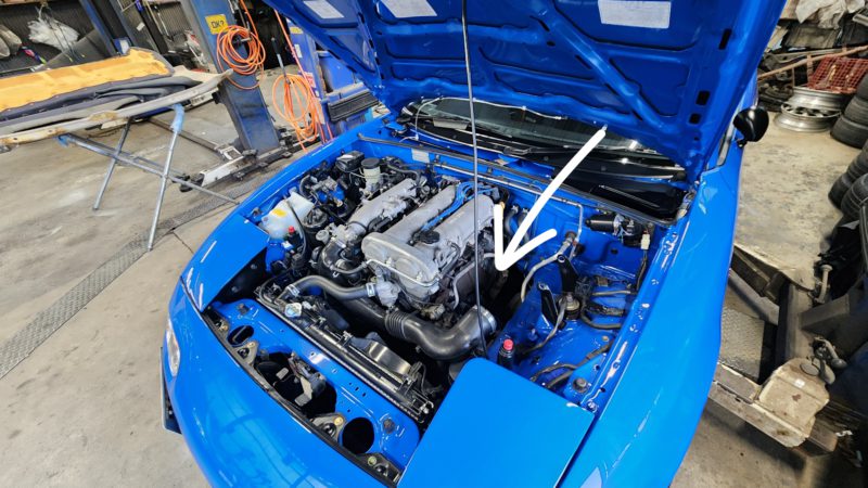 矢印のエキパイを外す為にタワーバーとエアクリーナーを外していきます。
