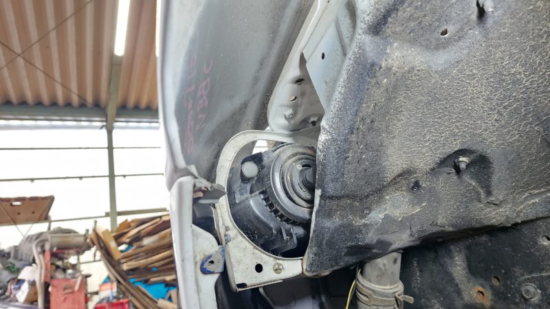 リフトに上げ、タイヤを外してバンパー裏側下部に装着されている