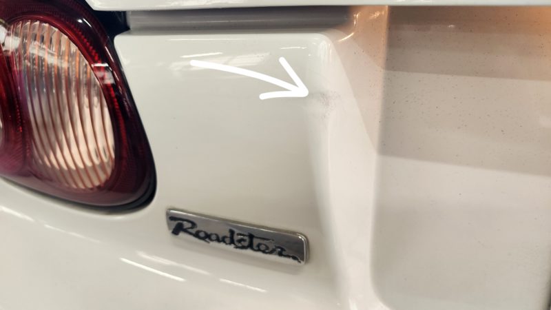 分かり易いのがリヤバンパーの矢印の部分にヘコミ。