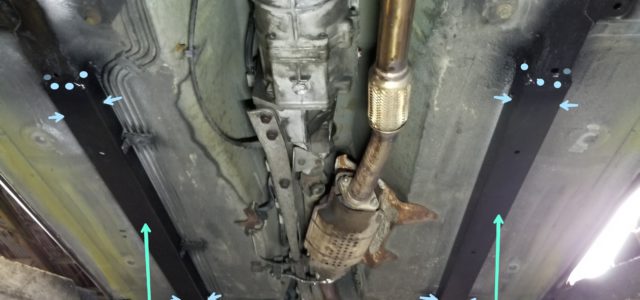 ・必要に応じてサイドフレームを補修してプロテクションを装着します。 ・片側につき4ヵ所リベット固定(青矢印)した後に両端を溶接(青点)によりしっかり固定します。・溶接固定部は塗装とコーキングで防錆対策も入念に行い腐食のリスクから車体を保護します。以上が街乗りを主体とする基本的な取付方法です。更に溶接で固定箇所を増やす事で強固な補強材としても使用できます。